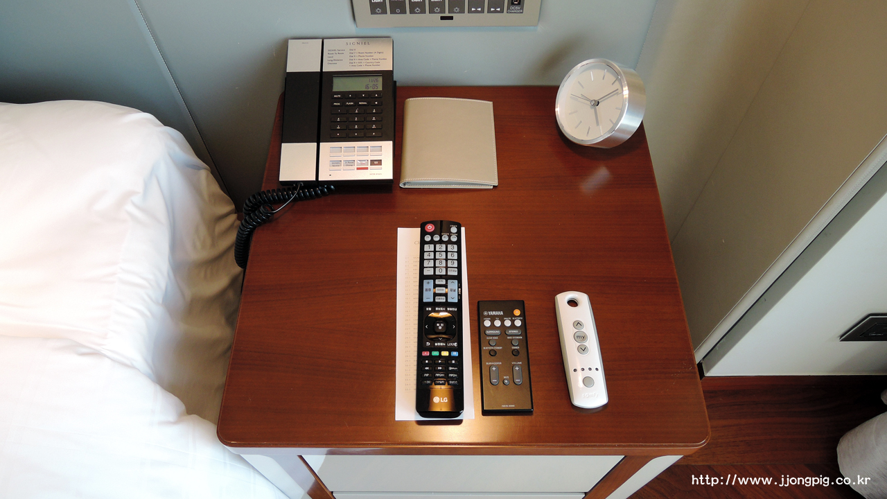 침대 옆에는 전화기, 시계, 다양한 리모컨 등이 있었는데, 창가쪽 커튼을 컨트롤 할 수도 있다. 커튼은 내가 직접 살짝 당기면 전체가 닫히고 밀면 전체가 열리기도 한다.