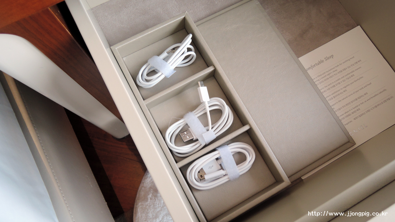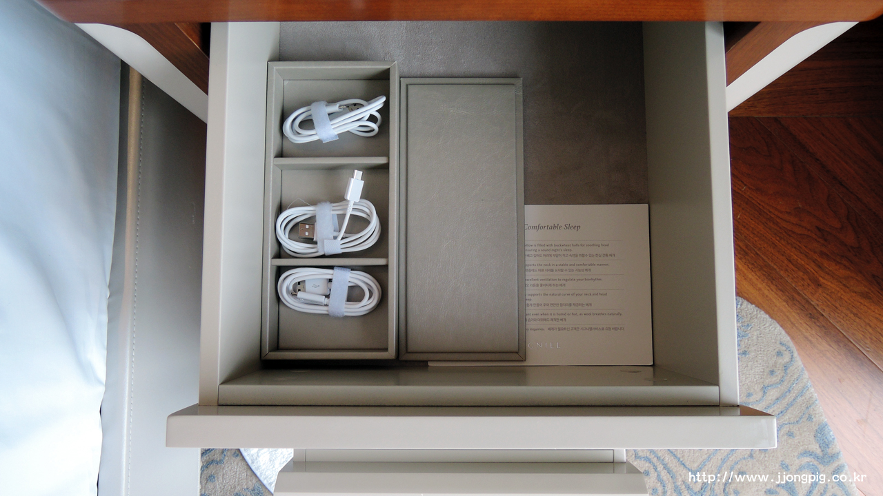 서랍을 열어보면 USB 포트를 이용한 케이블들이 구비되어 있었는데, 아이폰용 케이블과 마이크로 5핀 및 C 타입까지 다양하게 준비되어 있었다.