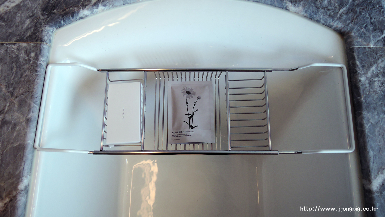 욕조를 보면 KOHLER 제품으로 구성되어 있고, 소금과 꽃잎 등으로 구성된 입욕제 등도 확인 가능하다. 욕조에 따뜻한 물이 채워지는 시간은 최소 15분 정도는 걸리는데, 욕조가 꽤 큰 편이다. 욕조에 몸담그고 있다가 발이 끝에 닿지 않아 미끄러지며 얼굴이 잠기기 힘든데, 여기는 충분히 가능하다.