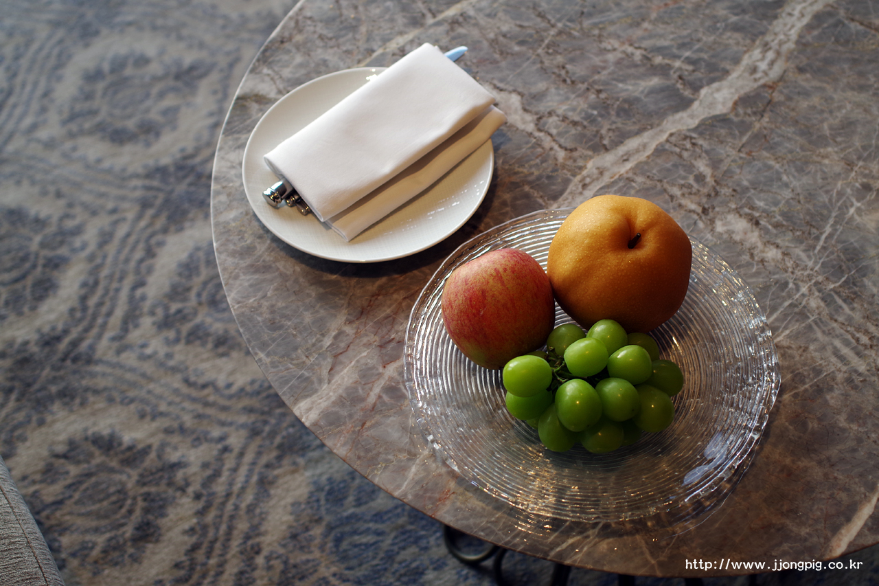 사실 체크인 하는 동안 웰컴 드링크 등을 주는 경우가 일반적인데, 시그니엘 서울은 체크인 후 방에 들어가서 제공을 해준다. 미리 셋팅되어 있지는 않고 별도로 갖다주셨었는데, 결혼기념일이라고 과일 등도 무료로 제공해주었다.