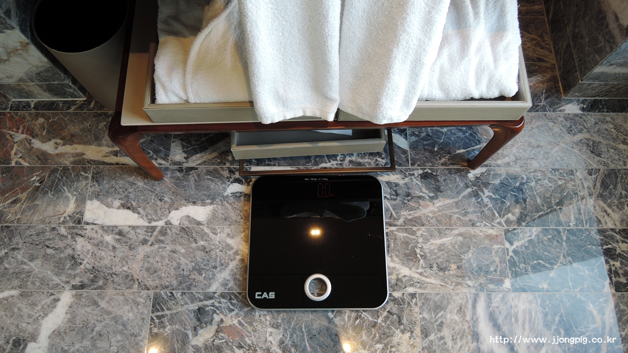 세면대 쪽도 구성이 알차다. 세면대는 1개이고, 하단에는 체중계, 헤어드라이어, 목욕 가운, 수건 등이 비치되어 있다. 세면대 옆에는 손 닦는 수건과 기타 물품들이 구비되어 있으며, 플러그인도 110V와 220V 모두 사용 가능하다. 헤어드라이어는 테팔 제품인데 가볍고, 바람 좀 세게나오고 냉풍 기능이 있는 가성비 좋은 모델 정도로만 구성이 되어있다.