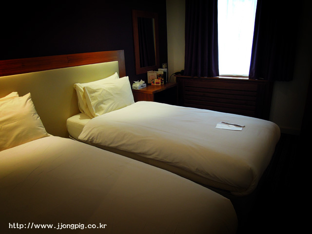 런던에 갔는데 일본 도심의 비즈니스 호텔을 만났다고 보면된다. 그렇다고 호텔이 현대식 호텔도 아니고 전형적인 영국의 3성급 호텔인데, 방의 사이즈가 작아 짐도 테트리스처럼 정리해야되고, 샤워실에서도 빡빡하게 움직여야 하는데 이걸 모르고 가면 실망에 실망이 더해질것같다.