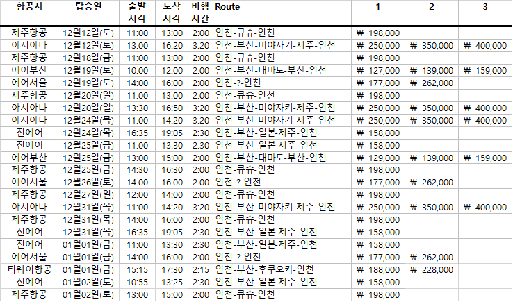 시간 Route 1 2 3 제주항공 12월12일(토) 11:00 13:00 2:00 인천-큐슈-인천  ₩ 198,000     아시아나 12월12일(토) 13:00 16:20 3:20 인천-부산-미야자키-제주-인천  ₩ 250,000  ₩ 350,000  ₩ 400,000 제주항공 12월18일(금) 11:00 13:00 2:00 인천-큐슈-인천  ₩ 198,000     에어부산 12월19일(토) 10:00 12:00 2:00 인천-부산-대마도-부산-인천  ₩ 127,000  ₩ 139,000  ₩ 159,000 에어서울 12월19일(토) 14:00 16:00 2:00 인천-?-인천  ₩ 177,000  ₩ 262,000   제주항공 12월20일(일) 11:00 13:00 2:00 인천-큐슈-인천  ₩ 198,000     아시아나 12월20일(일) 13:30 16:50 3:20 인천-부산-미야자키-제주-인천  ₩ 250,000  ₩ 350,000  ₩ 400,000 아시아나 12월24일(목) 11:00 14:20 3:20 인천-부산-미야자키-제주-인천  ₩ 250,000  ₩ 350,000  ₩ 400,000 진에어 12월24일(목) 16:35 19:05 2:30 인천-부산-일본-제주-인천  ₩ 158,000     진에어 12월25일(금) 11:00 13:30 2:30 인천-부산-일본-제주-인천  ₩ 158,000     에어부산 12월25일(금) 13:00 15:00 2:00 인천-부산-대마도-부산-인천  ₩ 129,000  ₩ 139,000  ₩ 159,000 제주항공 12월25일(금) 14:30 16:30 2:00 인천-큐슈-인천  ₩ 198,000     에어서울 12월26일(토) 14:00 16:00 2:00 인천-?-인천  ₩ 177,000  ₩ 262,000   제주항공 12월27일(일) 12:00 14:00 2:00 인천-큐슈-인천  ₩ 198,000     아시아나 12월31일(목) 11:00 14:20 3:20 인천-부산-미야자키-제주-인천  ₩ 250,000  ₩ 350,000  ₩ 400,000 제주항공 12월31일(목) 14:00 16:00 2:00 인천-큐슈-인천  ₩ 198,000     진에어 12월31일(목) 16:35 19:05 2:30 인천-부산-일본-제주-인천  ₩ 158,000     진에어 01월01일(금) 11:00 13:30 2:30 인천-부산-일본-제주-인천  ₩ 158,000     에어서울 01월01일(금) 14:00 16:00 2:00 인천-?-인천  ₩ 177,000  ₩ 262,000   티웨이항공 01월01일(금) 15:15 17:30 2:15 인천-부산-후쿠오카-인천  ₩ 188,000  ₩ 228,000 진에어 01월02일(토) 10:55 13:25 2:30 인천-부산-일본-제주-인천  ₩ 158,000 제주항공 01월02일(토) 13:00 15:00 2:00 인천-큐슈-인천  ₩ 198,000
