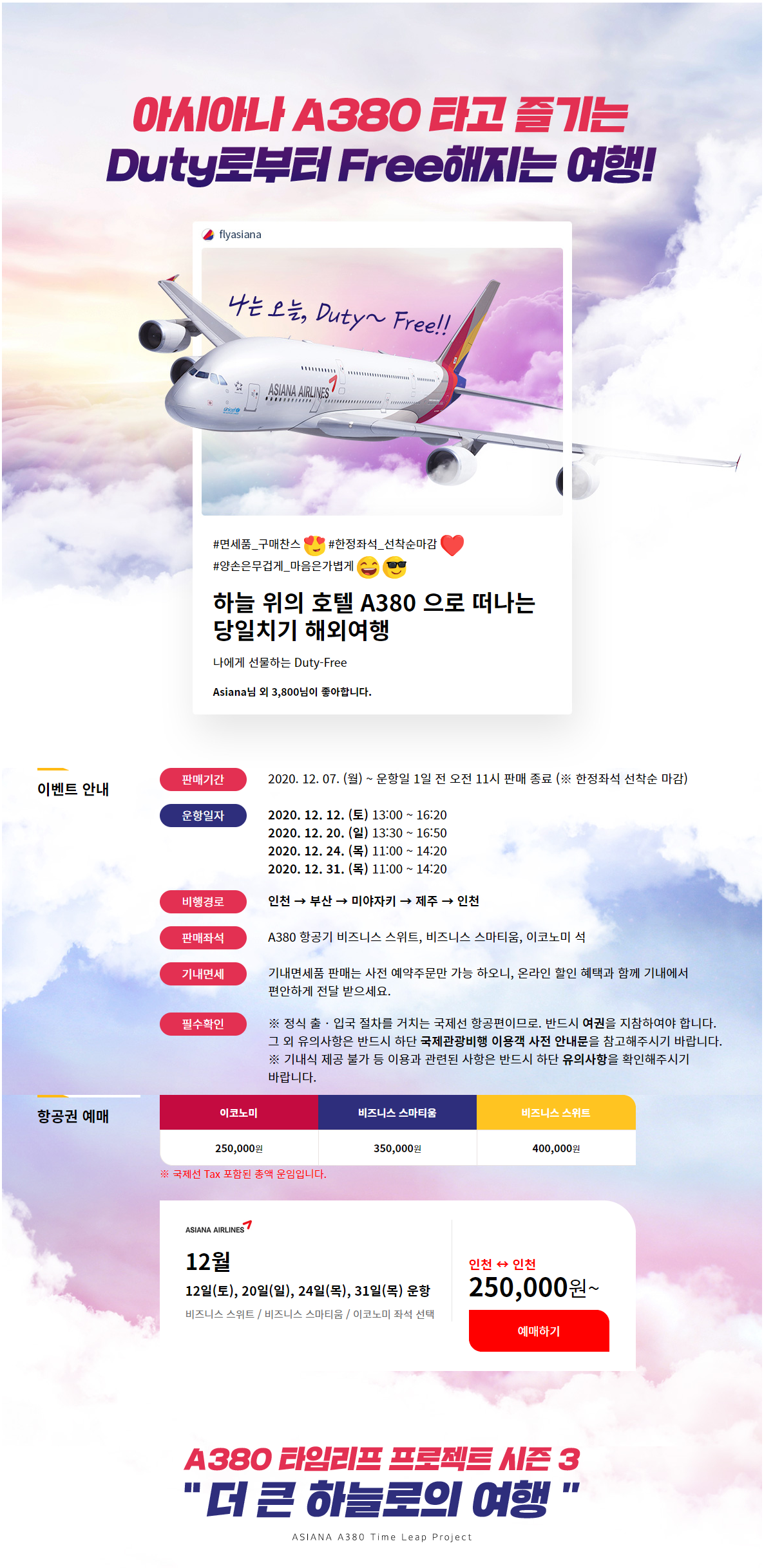하지만 이벤트 페이지에서 탑승일은 12월 19, 26일, 1월 1일 이렇게 세개 날짜를 안내하지만 실제 예약 가능한 날짜는 1월 1일 하루 뿐이고, 인천에서 인천으로 돌아온다는 내용은 있지만 어디 상공을 날아다니는지에 대해서는 설명이 전혀없다. 무언가 급하게 허겁지겁 진행하는 모습이다.