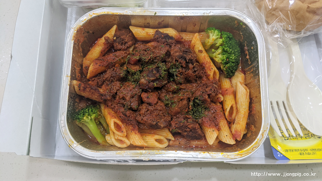 사진만 봐도 알겠지만 편의점 등에서 판매하는 도시락보다는 훨씬 낫다. 재료만 봐도 편의점 도시락 등과 비교할 수는 없다. 그리고 파리바게뜨나 파리크로아상에서 6~7천원 정도에 판매하는 냉동파스타 등 보다 좀 더 낫다.