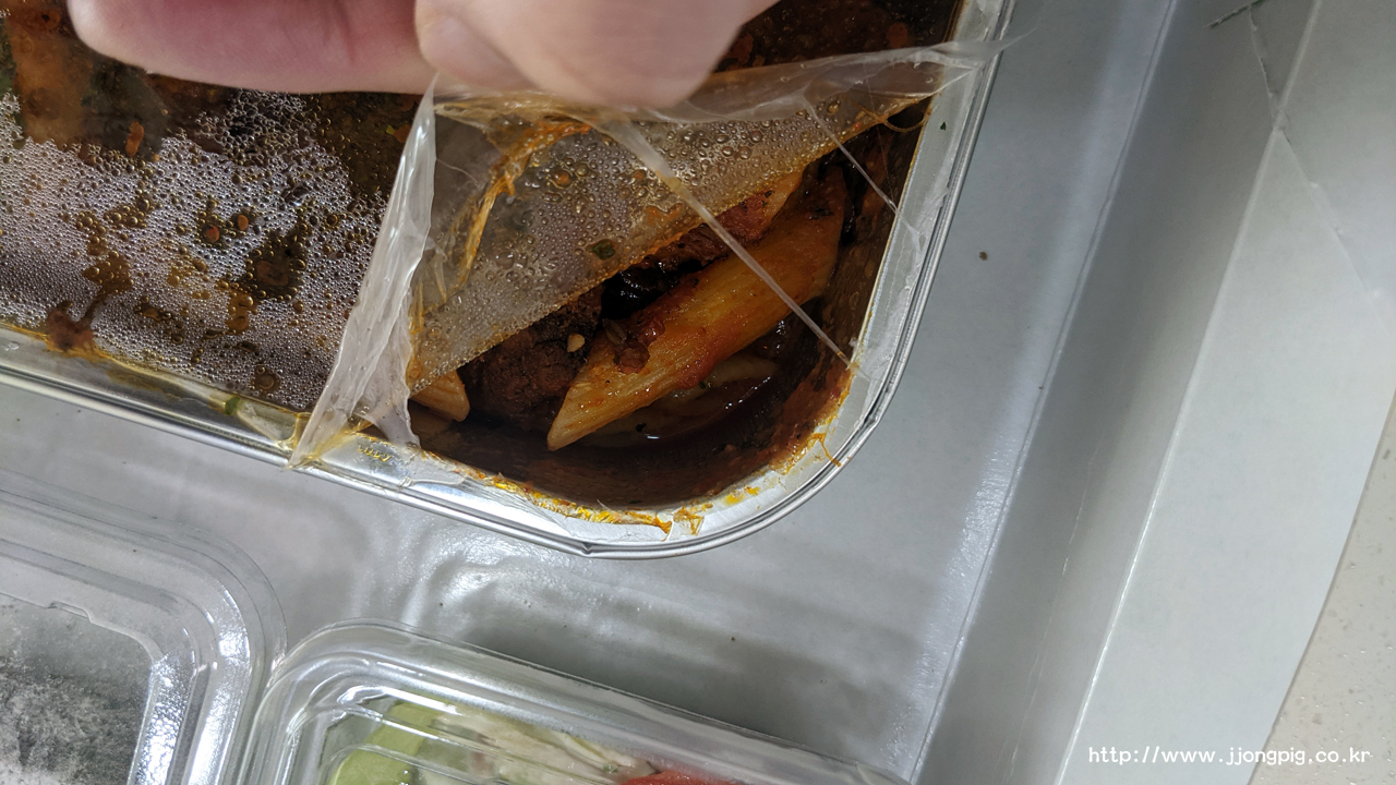 그런데 뚜껑을 열자마자 샐러드 뚜껑은 열려있고, 샐러드 소스는 케이스 뚜껑에 묻어있고 처음부터 많이 놀랐다. 어떻게 이렇게 배송을 할 생각을 했을까? 노량진에서 활어회를 당일 배송하더라도 포장을 꼼꼼하게 하는데, 진에어는 환경보호 정신이 투철해서 이렇게 뚜껑만 살짝 끼운......그런거라고 좋게좋게 생각하려고 한다.