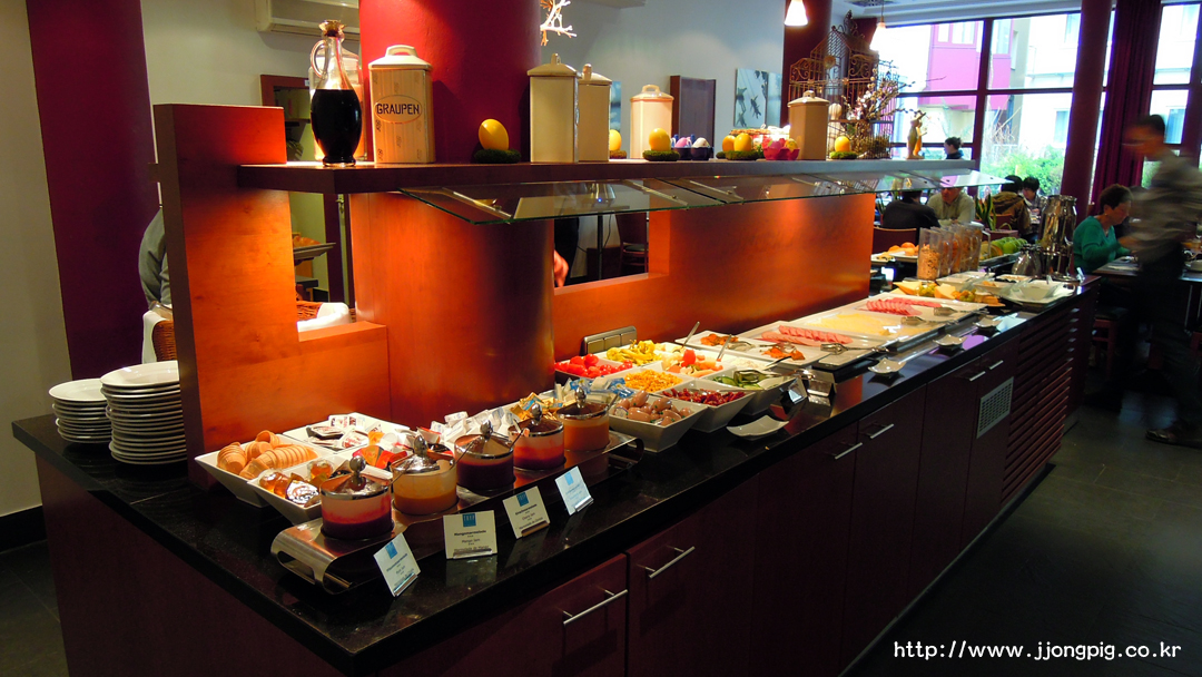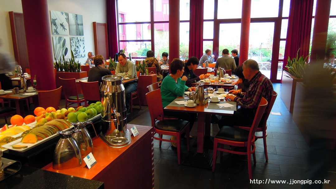 겉은 평범한 건물인데 안에 들어갔더니 정말 컬러풀하면서도 뭔가 독일스러운? 분위기의 로비가 확인될것이다. 이 곳 리셉션 직원들은 손님과 유쾌한 대화를 잘 이끌어내는것 같다. 5성급 호텔을 가면 체크인하면서 손님이 기다리는동안 영혼없는? 매뉴얼대로의 질문을 꺼낼때도 있는데, 여기있는 직원분들은 손님하고 눈을 마주치면서 이야기하는것도 보이고 분위기가 밝은편이다.
