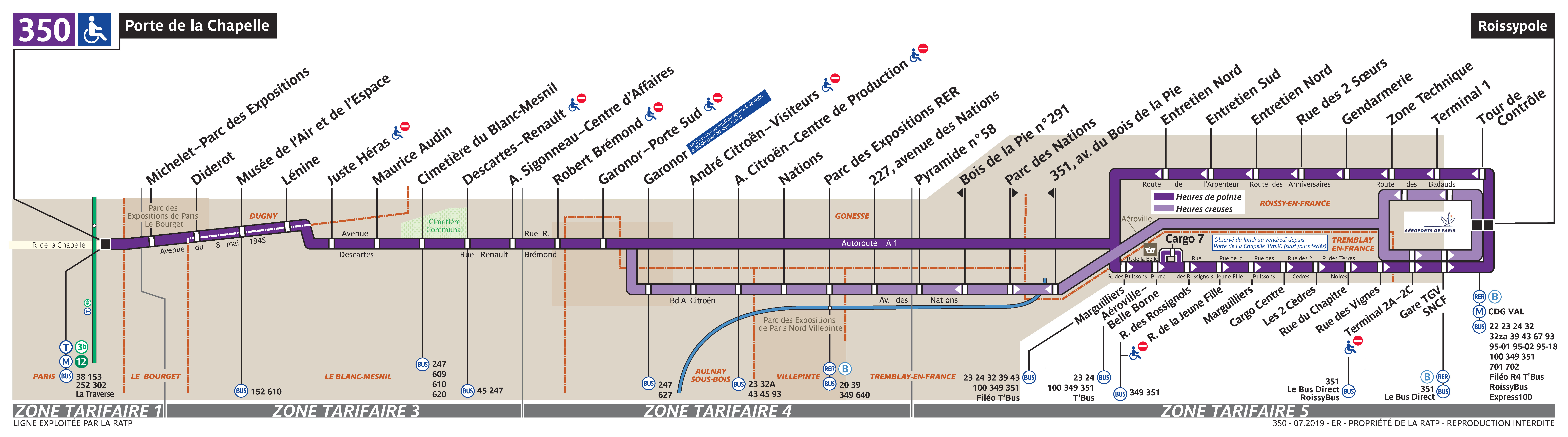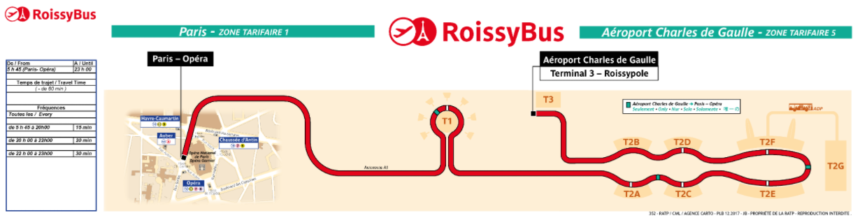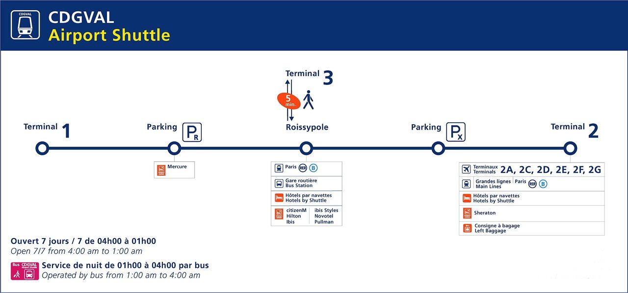 - 장점이자 단점은 샤를 드골공항의 터미널을 촘촘하게 다 거쳐간다는 점이며, 15~20분 간격으로 배차 스케줄이 구성된다.