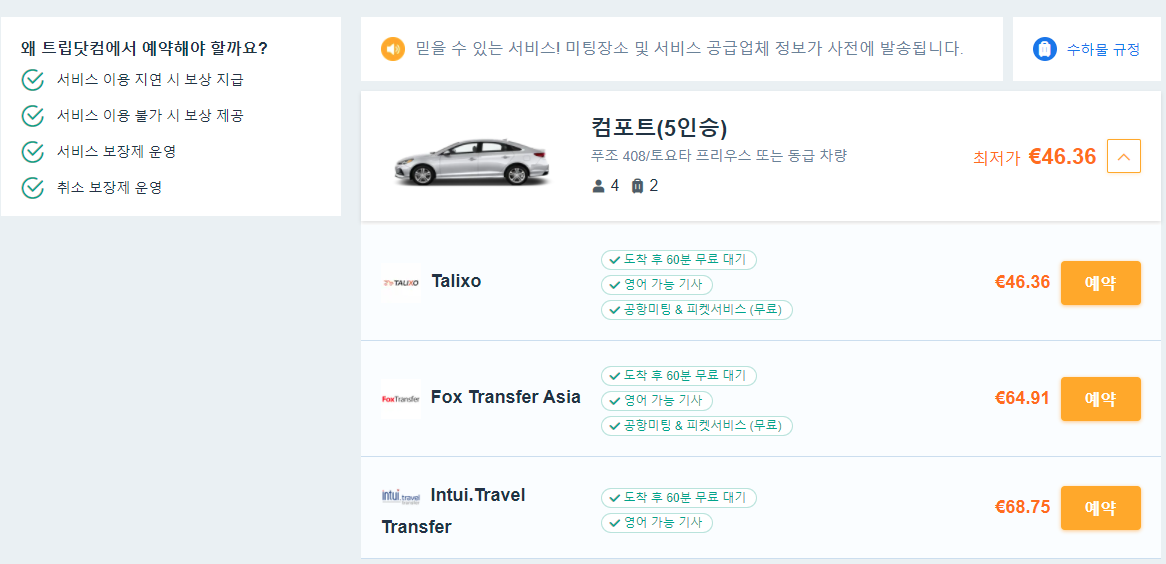 공항.픽업->공항 및 목적지, 인원, 스케줄 설정 후 이용하면 된다. - 사실 대중교통 이용 때 보다 도난 사고 가능성이 확 줄어드는 점이 장점이고, 인원이 3명 이상이라면 적극 추천한다. 더불어 허니문 여행이나 비즈니스 출장객에게 적극 권장한다.