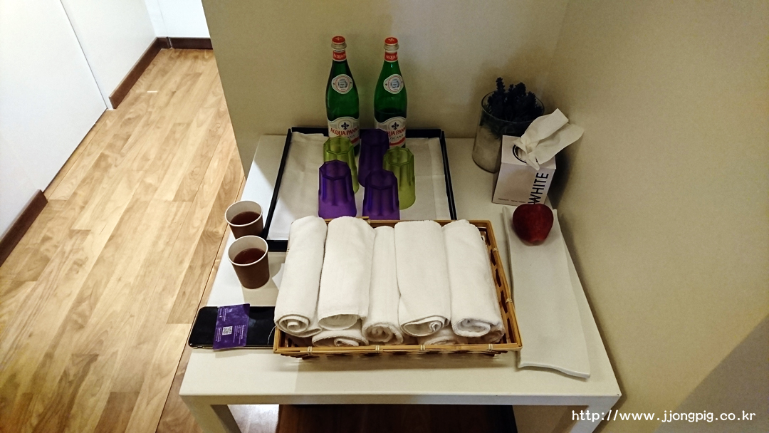 방에는 원형의 큰 테이블이 있는데, 그 공간에는 미니바에 있을법한 유리잔이나 생수 등이 진열되어 있었다. 물론 대부분 유료다.