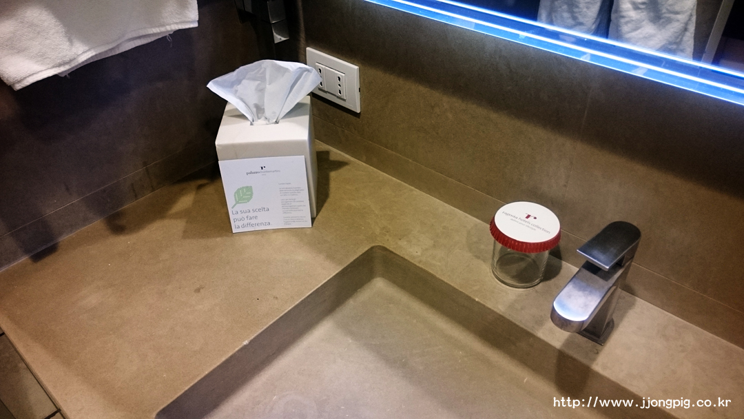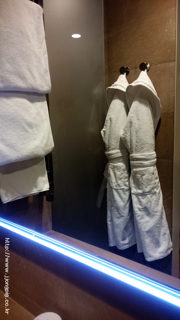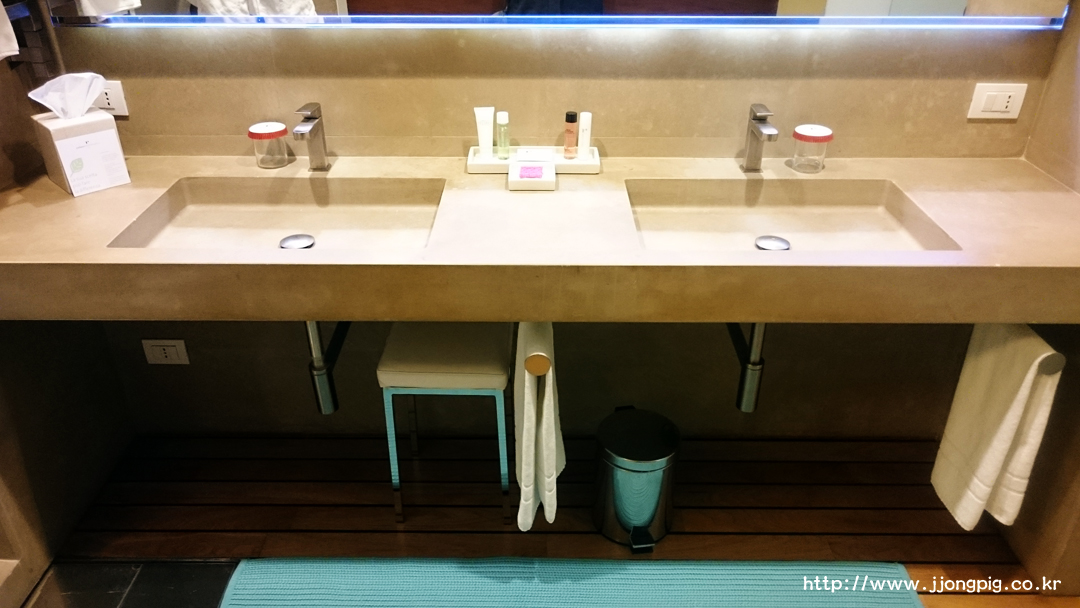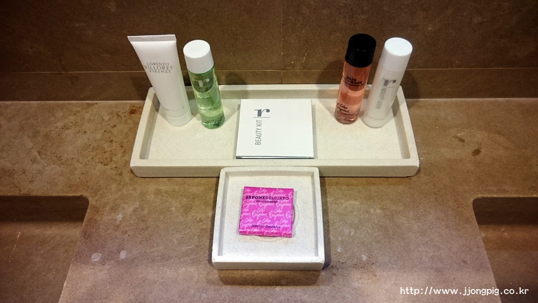 세면대가 두개가 있고 왼쪽에는 샤워실이 오른쪽에는 화장실이 구분되어 있다. 그런데 5성급 호텔 치고는 어메니티 구성이 좀 약하다. 근청 nh Collection 호텔 같으면 농협거 샴푸나 린스 등의 기본적인 구성이 괜찮은데 좀 아쉬운 부분이다. -.-