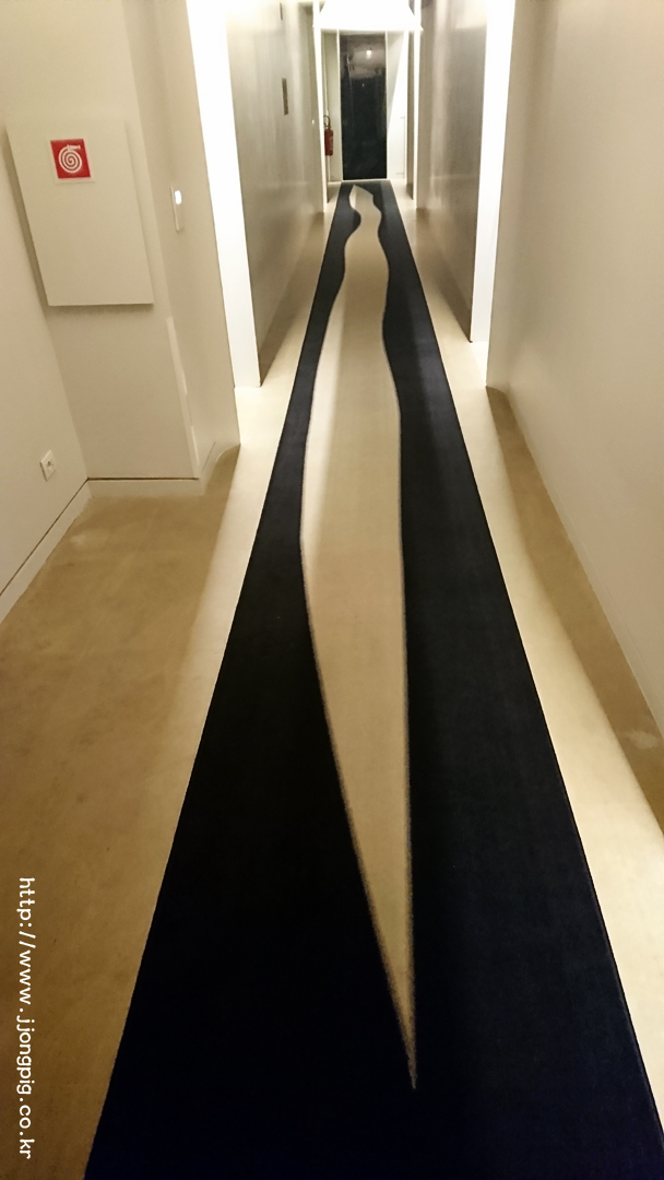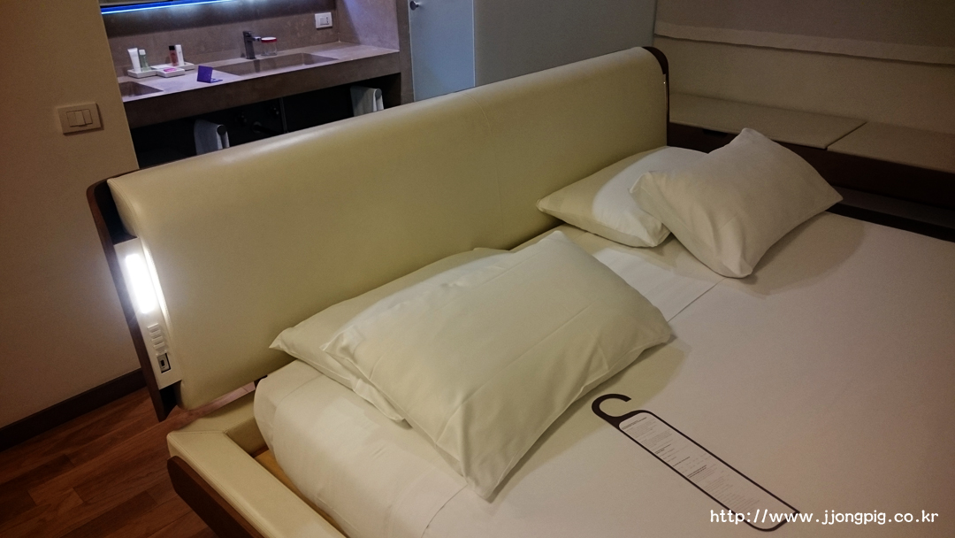 문을 열고 들어갔을 때 객실은 천장이 높고 밝은 색을 이용한 분위기라서 객실도 굉장히 크게 느껴졌다. 그리고 침대는 벽쪽을 바라보는 형태인데, 세면대쪽과는 구분없이 하나로 연결되어 있다. 또한 방의 벽쪽도 소파처럼 하나로 연결되어 있어서 조금 독특한 구조였다.