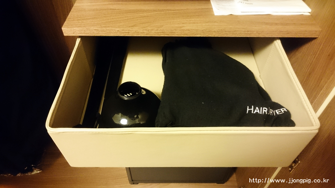 또한 옷장안에는 쪼리(조리)도 있었는데 호텔에 수영장이 있어서 필요한 경우에는 쓸 수도 있을 것 같다. 그리고 헤어드라이어는 여기 서랍장안에 따로 보관되어 있는데, 생각보다 깨끗하게 잘 관리되고 있었다.