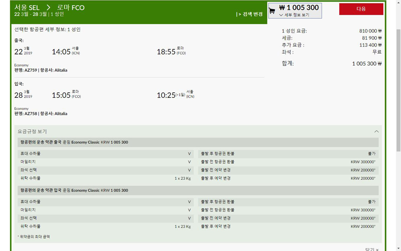 알이딸이라는 그냥 로마 왕복으로 조회했는데, 유류할증료가 200원 내려갔다.