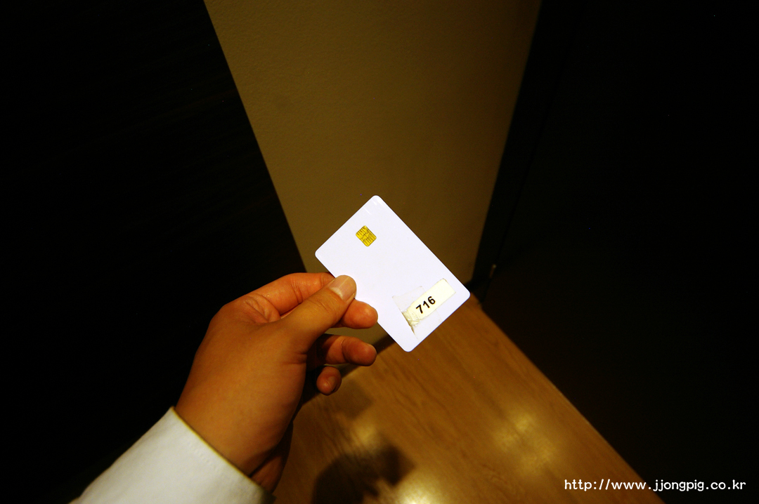 호텔 리셉션에서 키카드를 받으면, IC 신용카드 처럼 된 형태로 되어 있을것이다. 그리고 방 입구에서는 터치식이나 긁어서 읽히는 방식이 아니라 문 옆에 있는 리더기에 꽂아야 된다. 그리고 문을 살짝 당겨서 여는 구조다.